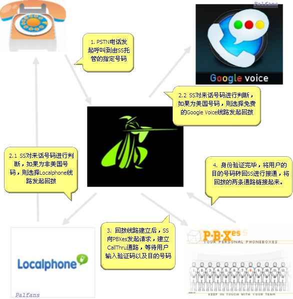 通过PSTN电话拨打到SS触发回拨时,不能附加参数,比如身份验证码和需要拨打的对端号码。这时就引入了PBXes,这套交换系统提供了CallThru功能,能在回拨接通后进行身份校验和接收对端号码。最后将数据送回SS进行处理,发起回拨的第二个链路。